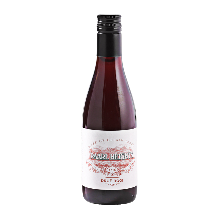 Wijn in kleine flesjes 25cl voor minibar en Hotels en als bedank geschenk. Paarl Heights Rooi 25cl Handig voor minibar en hotels. De Zuid Afrikaanse Paarl Heights Rooi 25cl heeft een diep rode, heldere kleur. Intense geur van rood fruit, zowel blauwe pruimen compote als rode bessen, bramen en kersjes. Volle smaak, met wederom veel rood fruit en kruidige tonen, zachte rijpe tannine en veel body. Combineer bij pasta Bolognese, bij oer-Hollandse gehaktballen en bij eenvoudige ragouts.